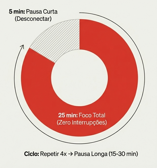 A procrastinação raramente é sobre preguiça; muitas vezes é sobre o medo da complexidade ou falta de energia. Para esses momentos, a técnica clássica do Pomodoro é imbatível.
