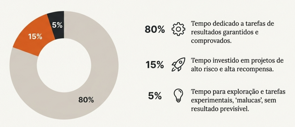 - Regra 80/15/5 de kent beck: Para uma gestão avançada, sugere-se dedicar 80% do tempo a resultados garantidos, 15% a tarefas de alto risco/retorno e 5% a experimentações (coisas “malucas”)