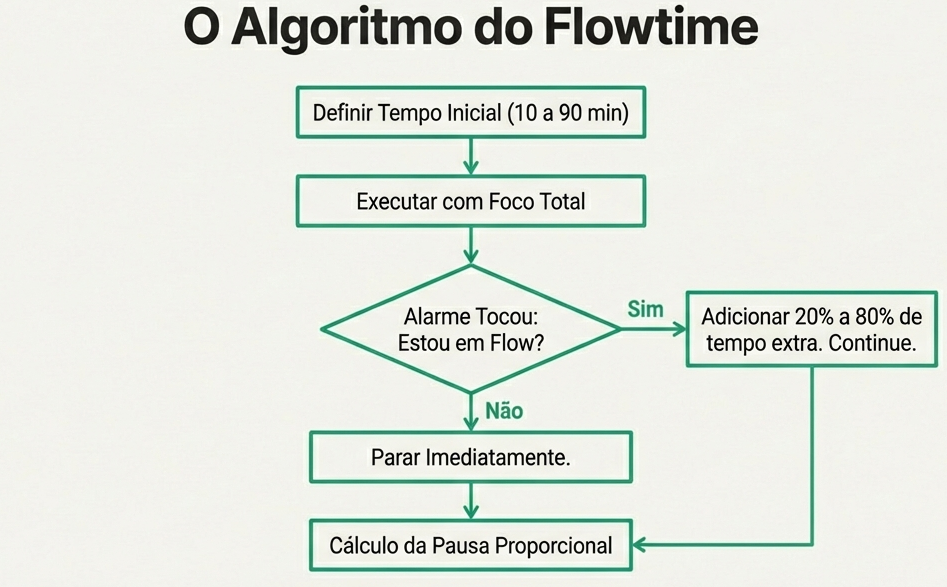 É aqui que entra a técnica Flowtime. Diferente da rigidez do Pomodoro, o Flowtime é elástico. Você inicia sessões que podem variar de 10 a 90 minutos