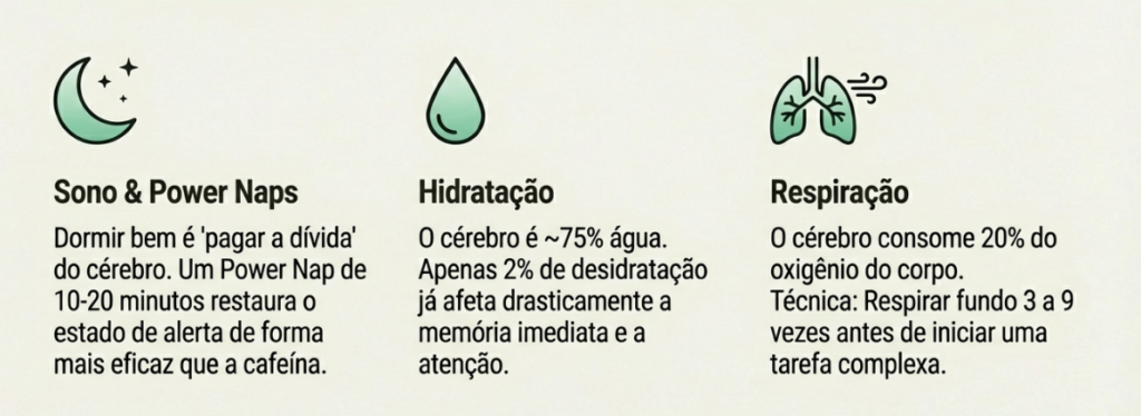 - Hidratação: O cérebro é 75% água. Uma desidratação de apenas 2% já prejudica a memória imediata e a psicomotricidade.